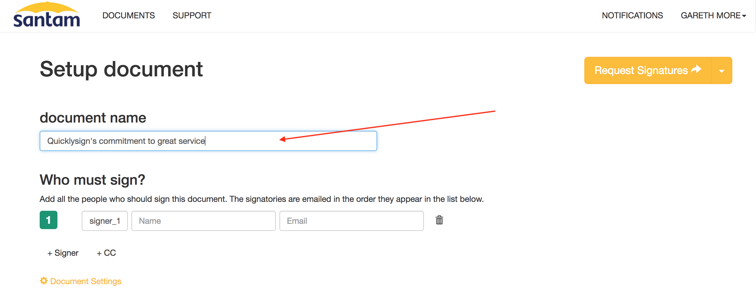 How to rename a document You can rename any document under the the Document Name section at the top of the page when in setup mode.
