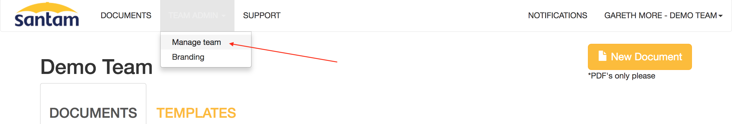 To add a user to a team, Click the [TEAM ADMIN] dropdown and select [MANAGE TEAM].